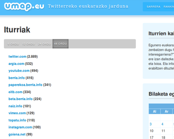 Iragan urteko maiatzean Umapek jasotzen dituen mezuen analisi berezia egin genuen, euskaldunok Twitterren partekatzen ditugun iturriak aztertuz. Funtsean, euskaldunok zein iturri partekatzen ditugun jakin nahi genuen. Eskuz eta kalkulu orri bidez eginiko analisi hura automatizatu egin dugu, modu sinplean oraingoz, iturrien ranking-a sortuz.